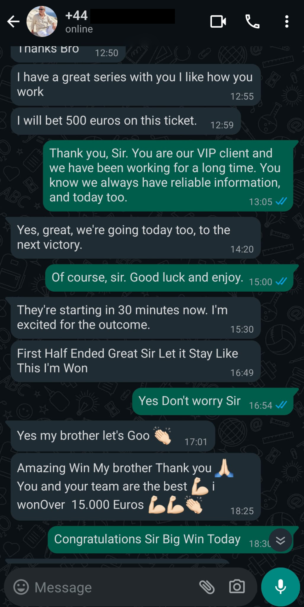 The certainty comes from a network, not a guess. Our approach is not analytical. It is informational. We gain direct insight into the processes behind certain matches through our network of contacts within clubs. This is not “I heard something”; it is verified information on the outcome, delivered to you with instructions: where, when, and how much to bet.
